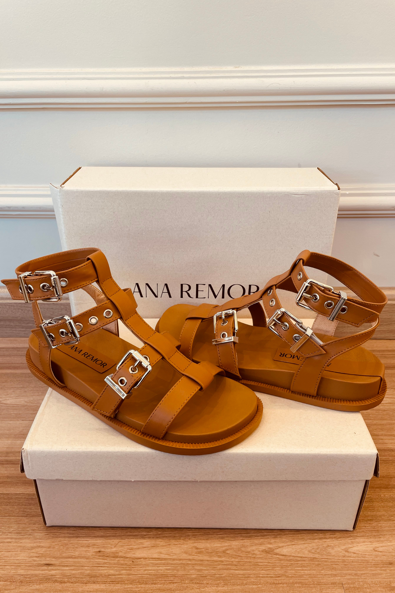 Sandalia Mari caramelo, com detalhes em fivelas prata, forma fiel a numeração.