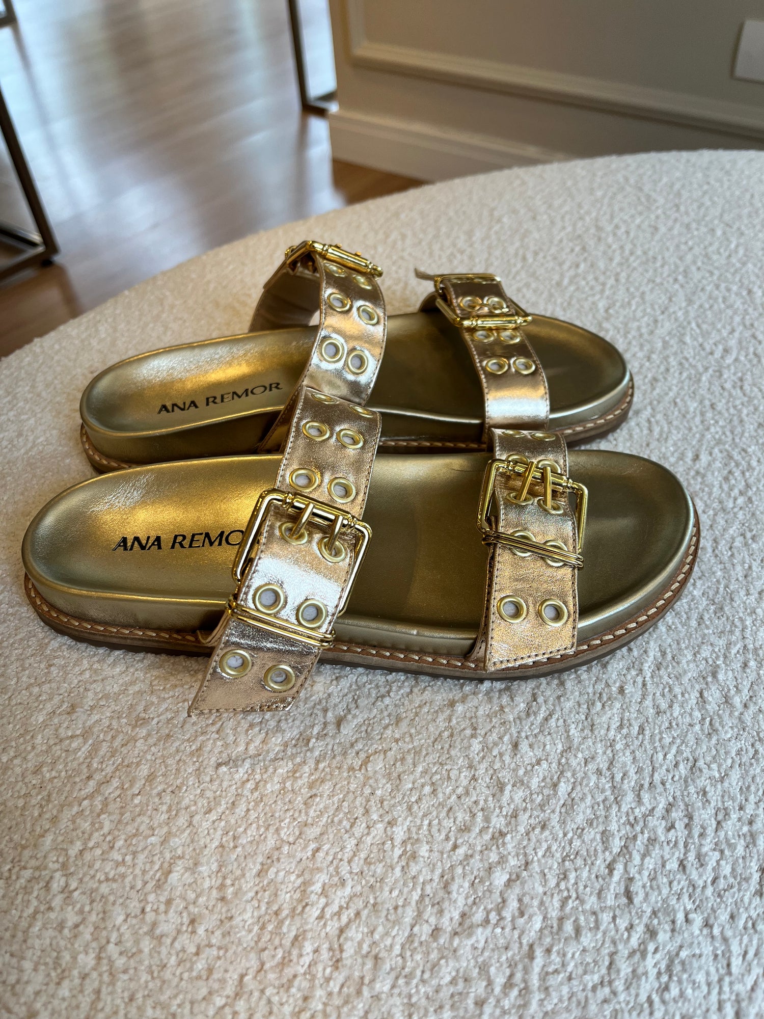 - Detalhe em couro com ilhós,com fivelas douradas.