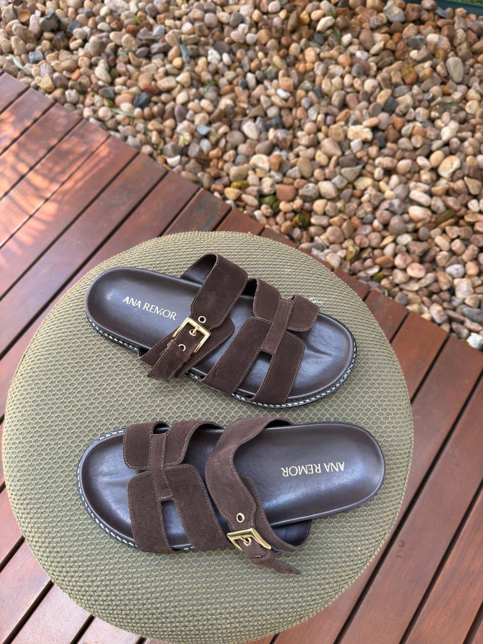 - Detalhe em camurça e fivela dourada.