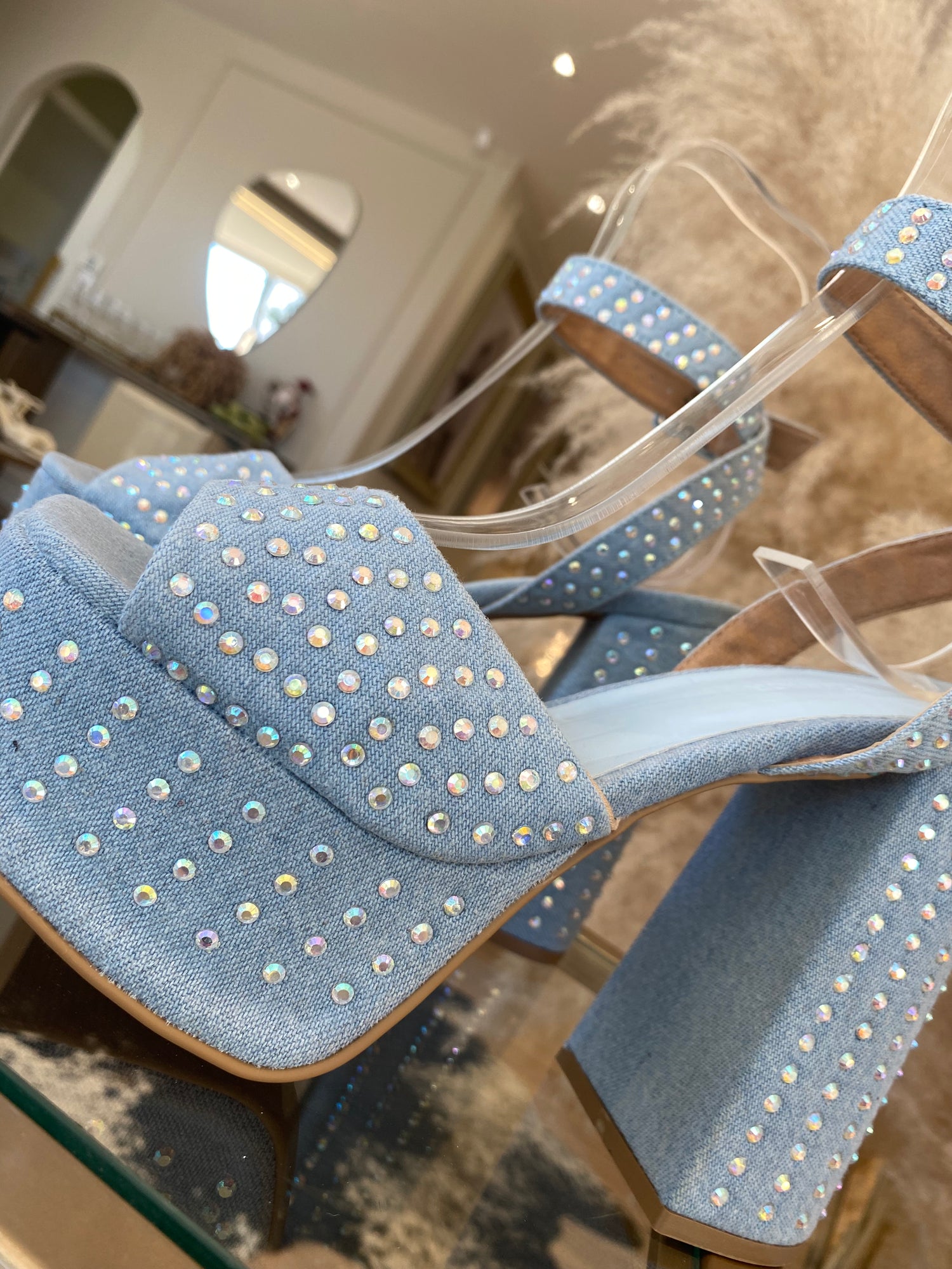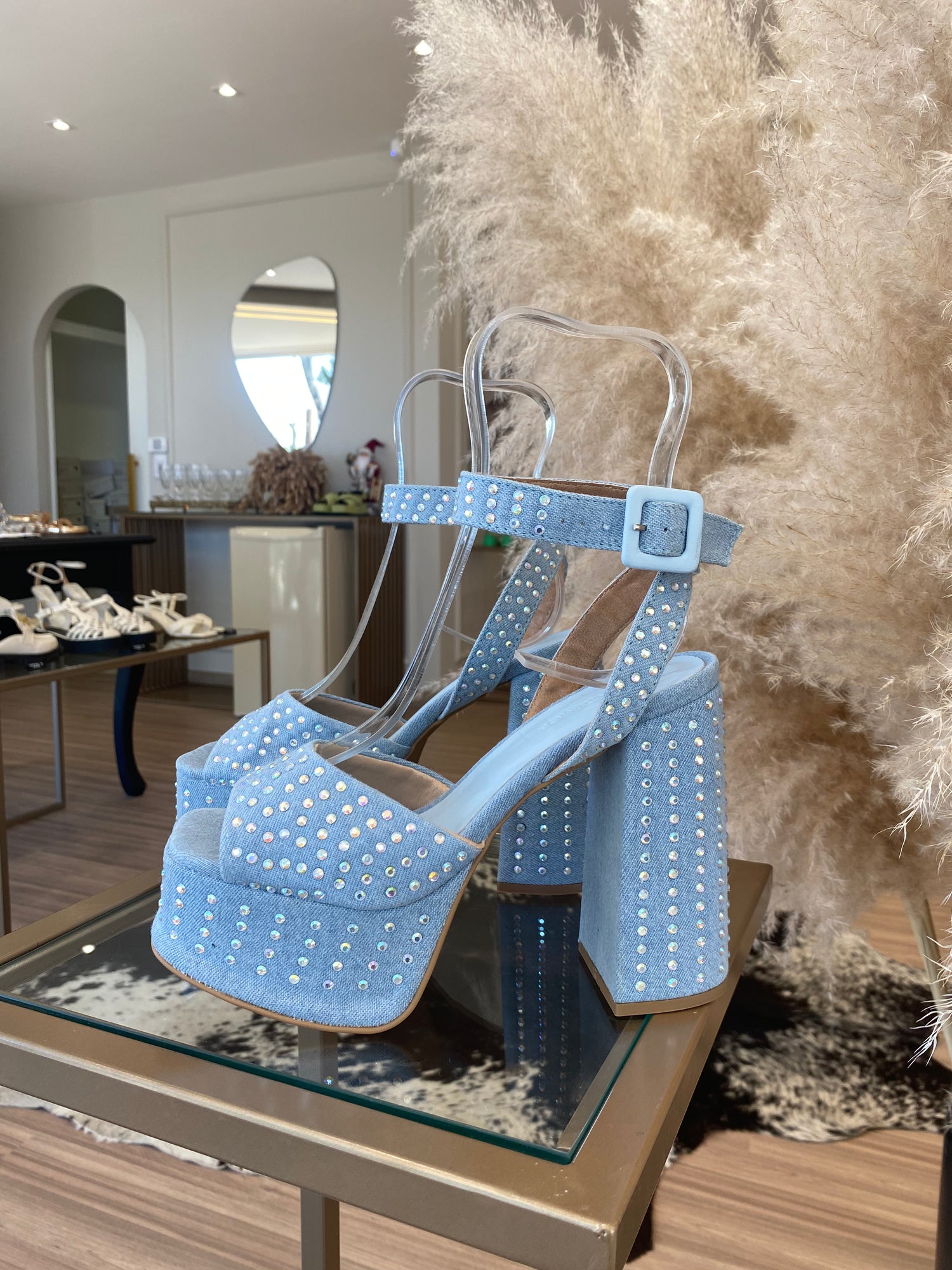 Sandalia meia pata jeans com aplicações em termo colante. Forma fiel a numeração!